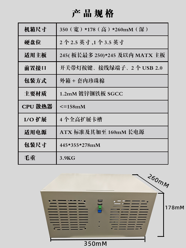 型号:华汖Hp-3.5U275A主板:ATX305*245或以下材质:1.2mM镀锌钢铁板SGCC硬盘:2.5英寸*1,3.5英寸*1电源:ATX标准及其加长电源扩展槽:7个全高扩展卡槽CPU散热器高...